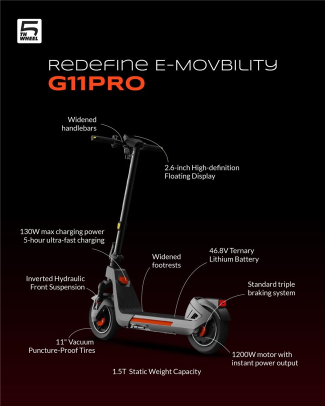 北京时间9 月 24 日晚,英凡蒂(INVANTI)科技有限公司在美国加州正式发布 5TH WHEEL 品牌全新旗舰电动滑板车 G11PRO。新车围绕“The Next-generation Escooter”的理念,将原本属于下一世代的动力、悬架与智能体验一次性带到 500美元的主流价位,目前已在5TH WHEEL独立站开启预售。